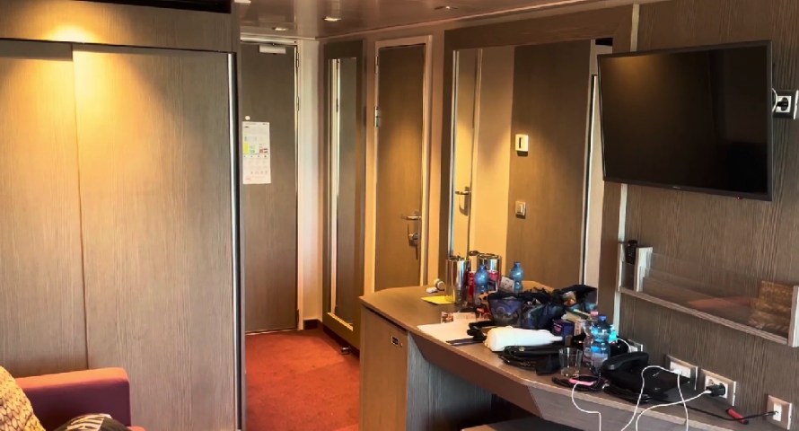 Eine der häufigsten Fragen vor einer Kreuzfahrt ist: Reicht der Stauraum? Ich kann euch beruhigen: Ja! Der große Kleiderschrank bietet eine Hängestange für Kleider, Hemden und Jacken sowie mehrere geräumige Fächer für gefaltete Kleidung. Auch der Safe ist hier untergebracht.