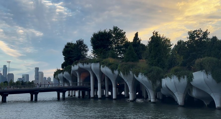 Wenn die Sonne im frühen Abendlicht hinter dem Hudson River versinkt, verwandelt sich Little Island in eine Kulisse, die fast zu perfekt wirkt, um real zu sein. Die 132 tulpenförmigen Betonstützen ragen wie Skulpturen aus dem Wasser und fangen das letzte Licht des Tages ein. Doch wer hier oben zwischen den blühenden Hügeln steht, blickt auf einen Ort, der eine der schwersten Lasten der New Yorker Seefahrtsgeschichte trägt.